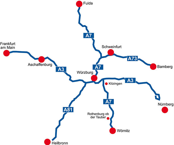 Unser Einsatzgebiet umfasst einen Radius von ca. 200 km rund um Würzburg.